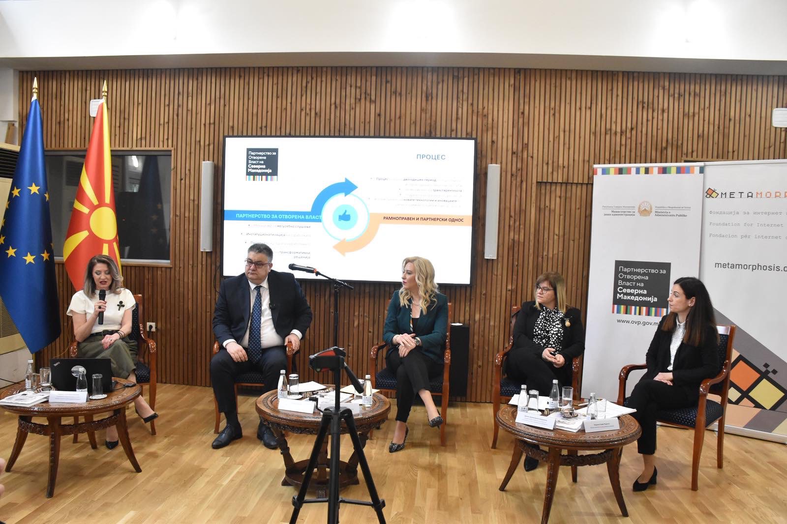 На конференцијата се обрати и националната координаторка за Партнерство за отворена власт во Министерството за јавна администрација, Гордана Гапиќ Димитровска, Марина Димовска, генерална секретарка на Собранието на Република Северна Македонија, како и Данче Даниловска-Бајдевска, координаторка на Мрежата на граѓански организации за ПОВ при Фондацијата Метаморфозис.
